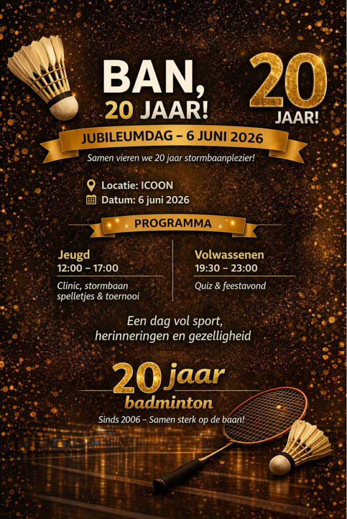 Het is eindelijk zover… BAN bestaat 20 jaar! En dat gaan we groots aanpakken. We willen iedereen uitnodigen voor een dag vol sport, herinneringen en gezelligheid.
